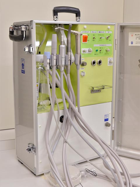 歯医者さんの診療室にあるチェアーユニットを持ち運び可能にしたもので、診療に必要なすべてのツールが揃っていて、来院された際と同じ治療を受けることができます。